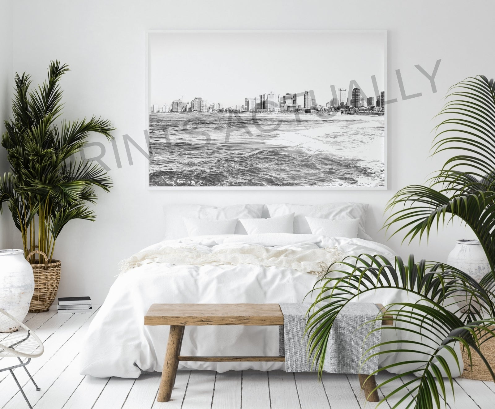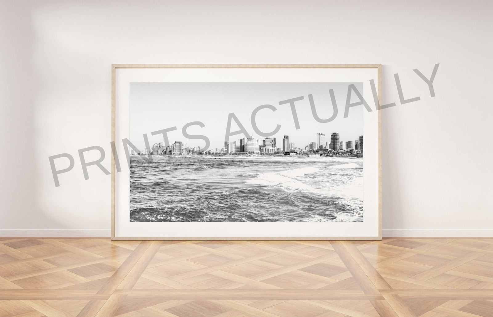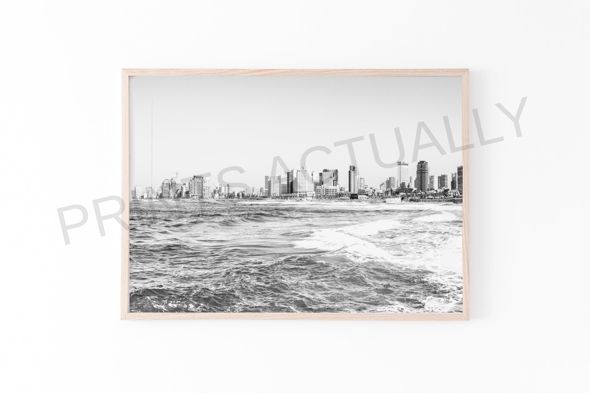 Descarga digital de impresiones en blanco y negro del horizonte de Tel Aviv. Esta es una foto original, tomada por nosotros. Puedes imprimirla tú mismo, en tu impresora, o en una imprenta.
